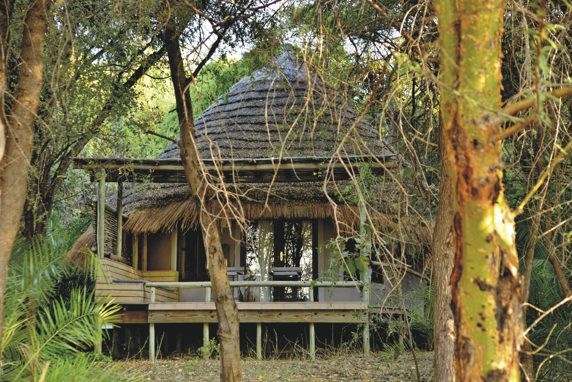 Der zentrale Bereich der familiengeführten Lodge präsentiert sich als großzügiges, strohgedecktes Gebäude, das mit seiner charmanten Bar und dem offenen Speisebereich zum entspannten Verweilen einlädt. Vor dem Gebäude breitet sich ein weitläufiges Holzdeck mit einer Feuerstelle aus – ein schöner Ort, um den Tag bei einem Sundowner mit Blick auf den Chobe Fluss ausklingen zu lassen. Ein besonderes Highlight ist das große, naturnahe Schwimmbecken, das ganz ohne chemische Zusätze auskommt und sich harmonisch in die umgebende Landschaft einfügt – ein erfrischendes Erlebnis im Einklang mit der Natur.Eingeschlossene Aktivitäten: Pirschfahrten, Bootsfahrten, Dorfbesuche und Fahrradtouren.