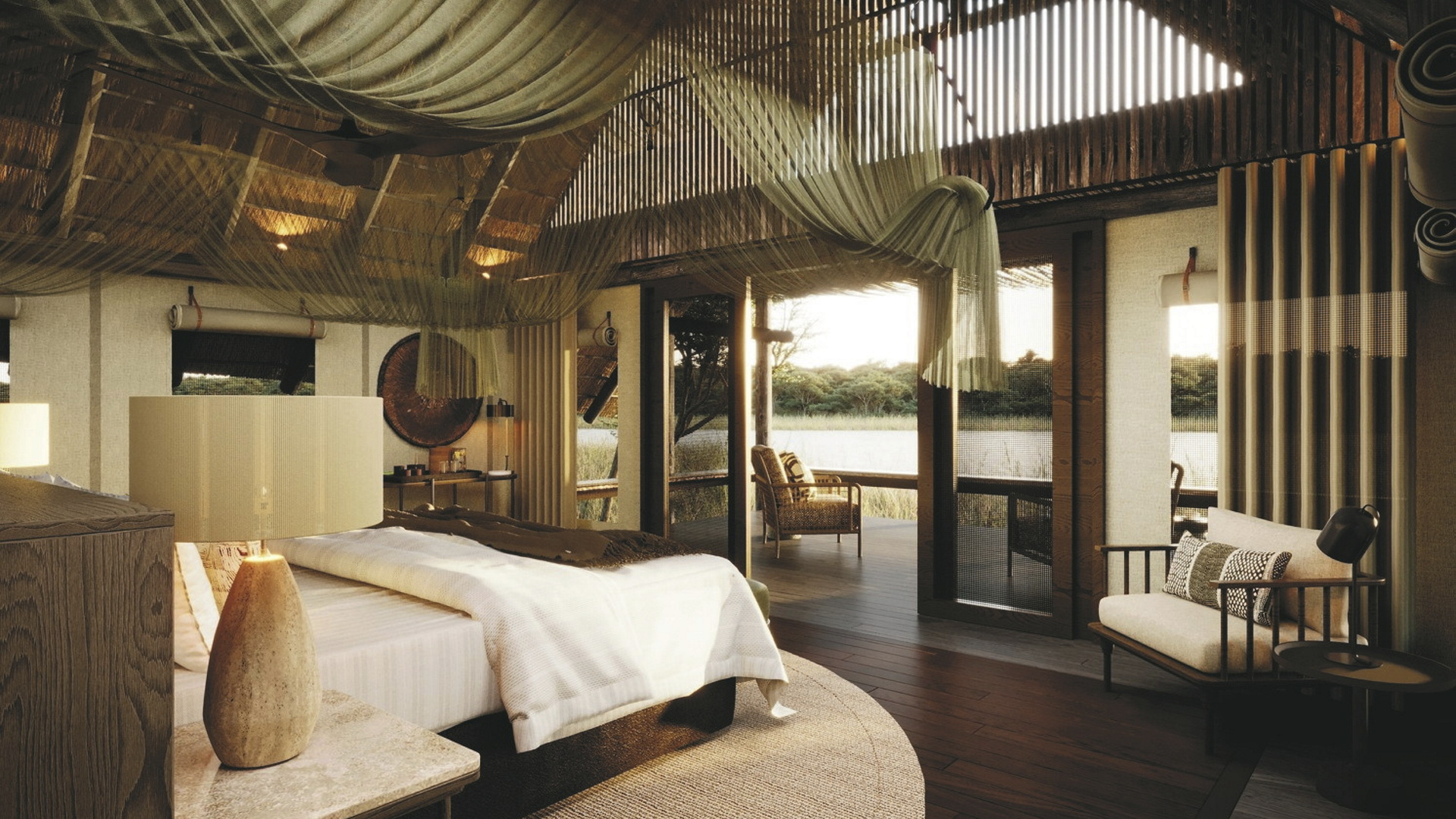 Die 15 Luxuszelte verbinden modernes Design mit afrikanischen Stilelementen: helle, großzügige Räume, traditionelle Reetdächer, dunkle Holzböden und stilvolle Details wie Marmortische und Moskitonetze über den Betten schaffen eine elegante, naturnahe Atmosphäre. Jedes Zelt verfügt über ein eigenes Badezimmer mit Doppelwaschbecken sowie Innen- und Außendusche. Das großzügige Familienzimmer besteht aus zwei separaten Schlafzimmern und zwei Badezimmern. Alle Zelte sind entlang des Khwai Flussufers verteilt und bieten von der privaten Terrasse aus einen freien Blick auf die umliegende Wildnis – ein idealer Ort für Tierbeobachtungen direkt vom Zimmer aus.