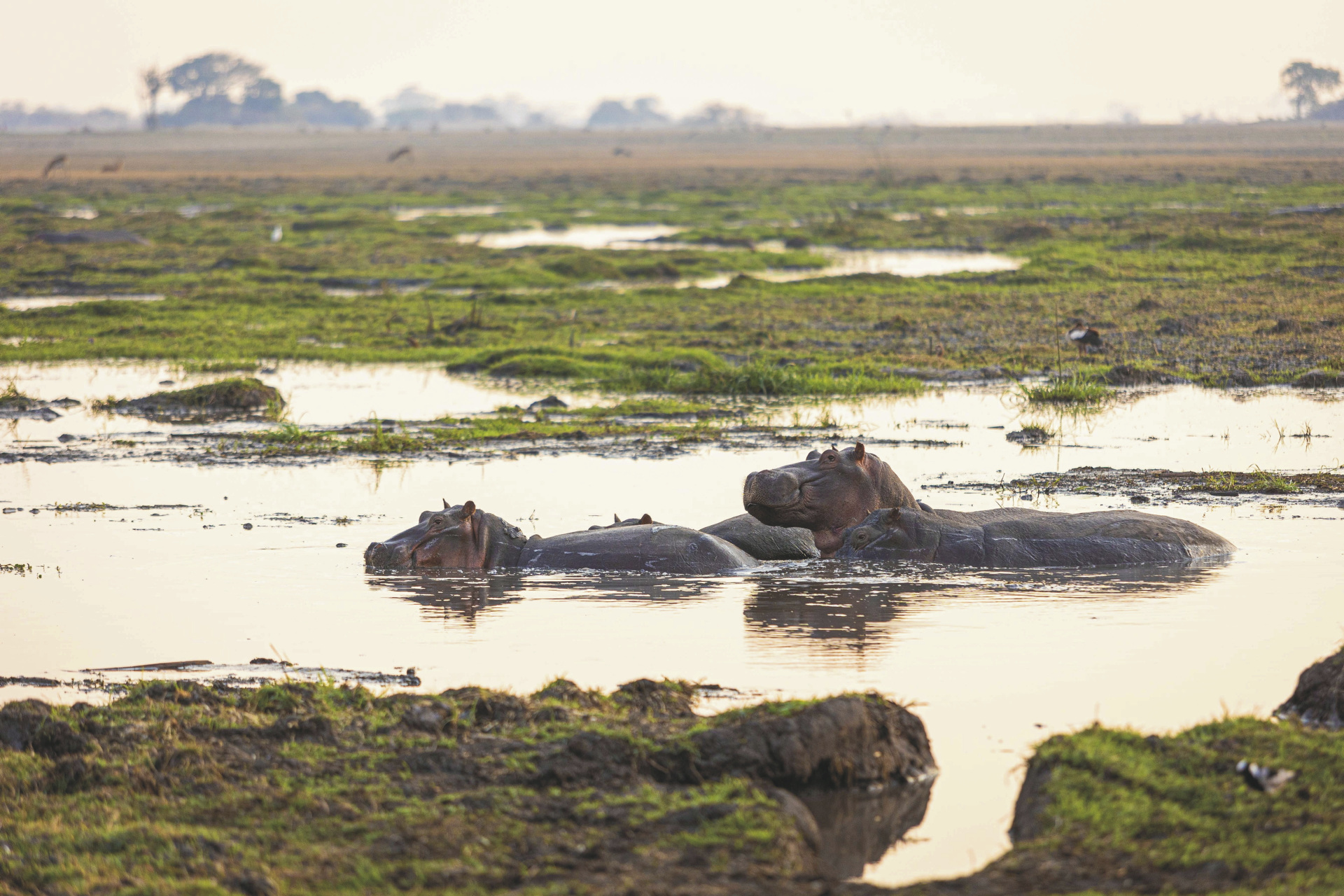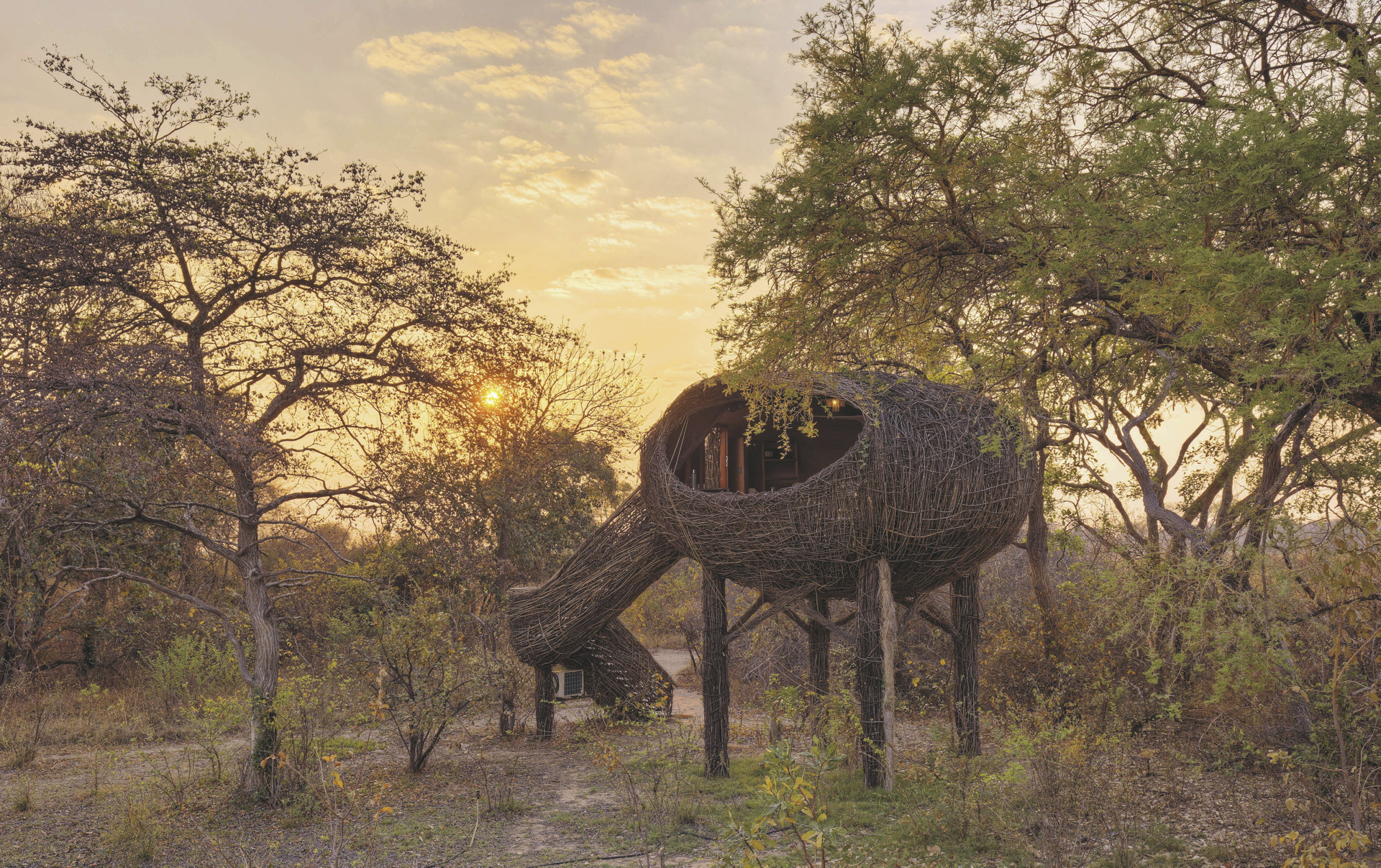Die sogenannten „Vogelnester“ sind luxuriöse Zeltunterkünfte, die vier Meter über dem Boden thronen und einen weiten Blick über die Busanga Plains bieten. Jedes Nest verfügt über ein eigenes Bad mit Dusche, Einzelwaschbecken und separater Toilette sowie Moskitonetzen und Ventilator. Die Ausstattung ist schlicht und funktional, mit liebevollen Details wie gefiltertem Kaffee und Tee sowie solarbetriebener Stromversorgung. Ein Nest ist barrierefrei und mit einem elektrischen Lift ausgestattet