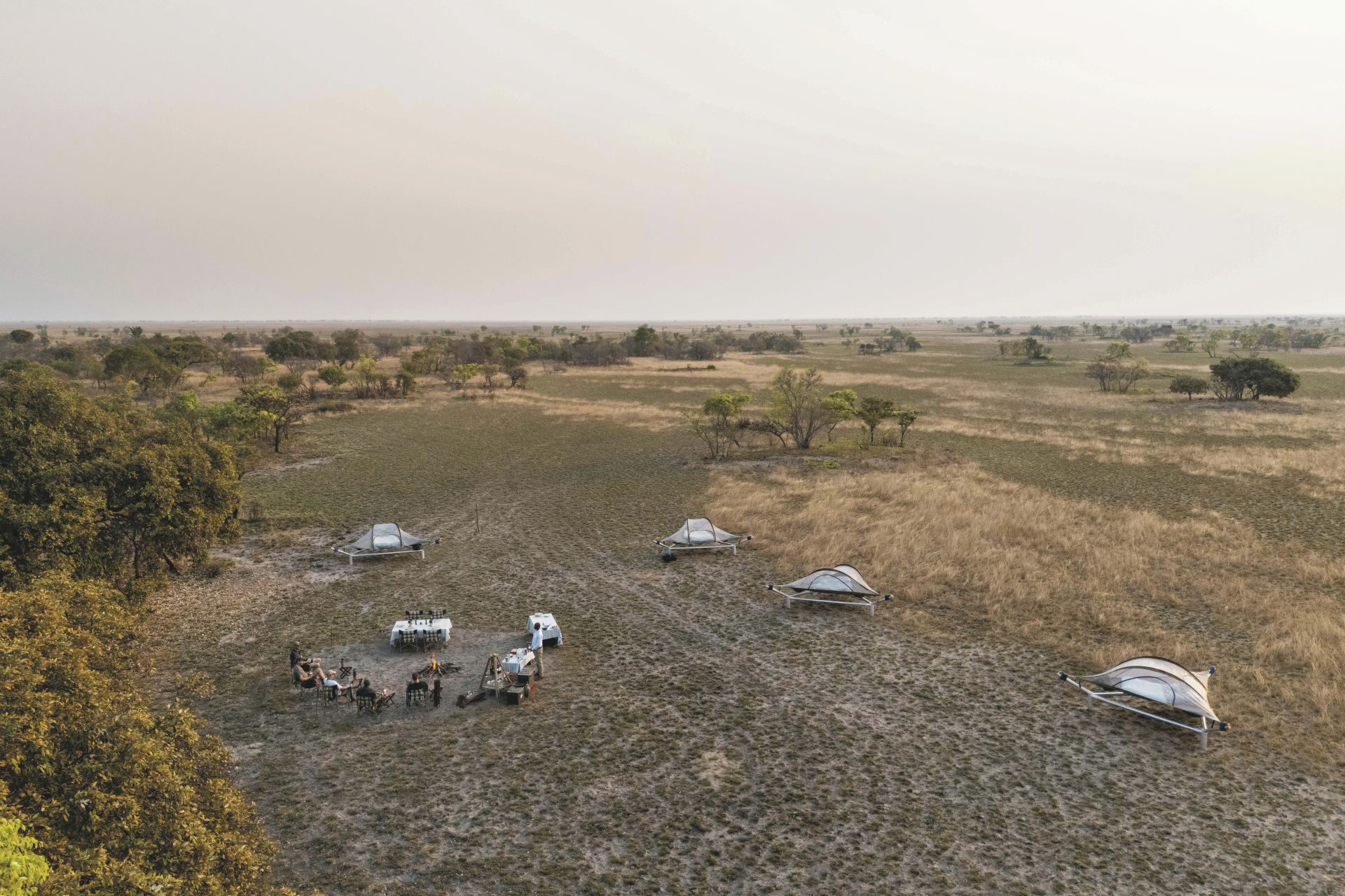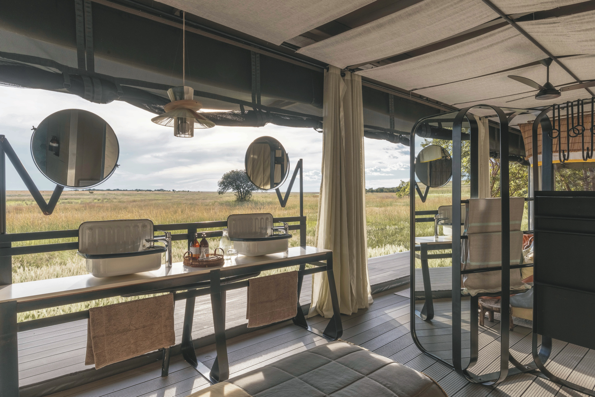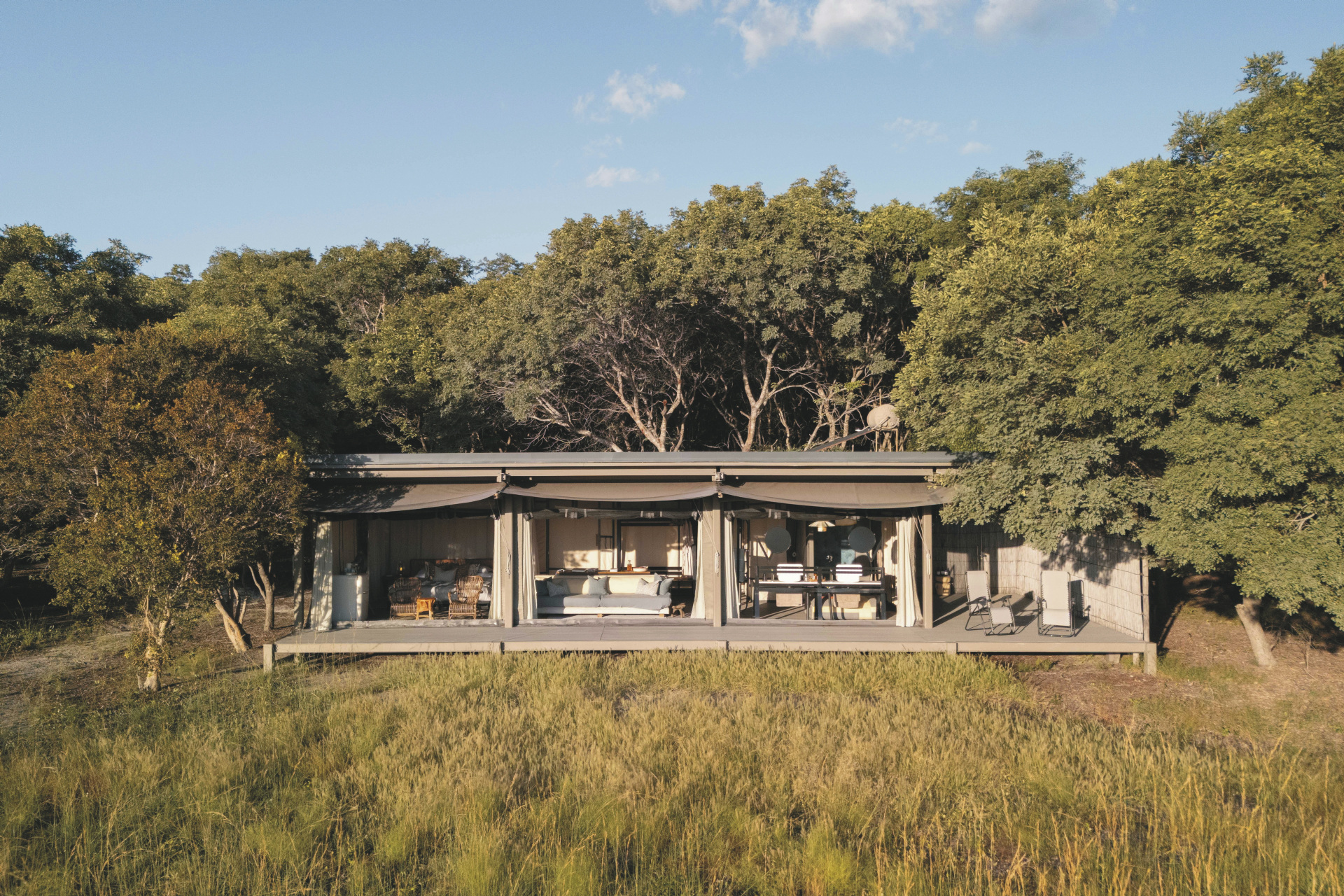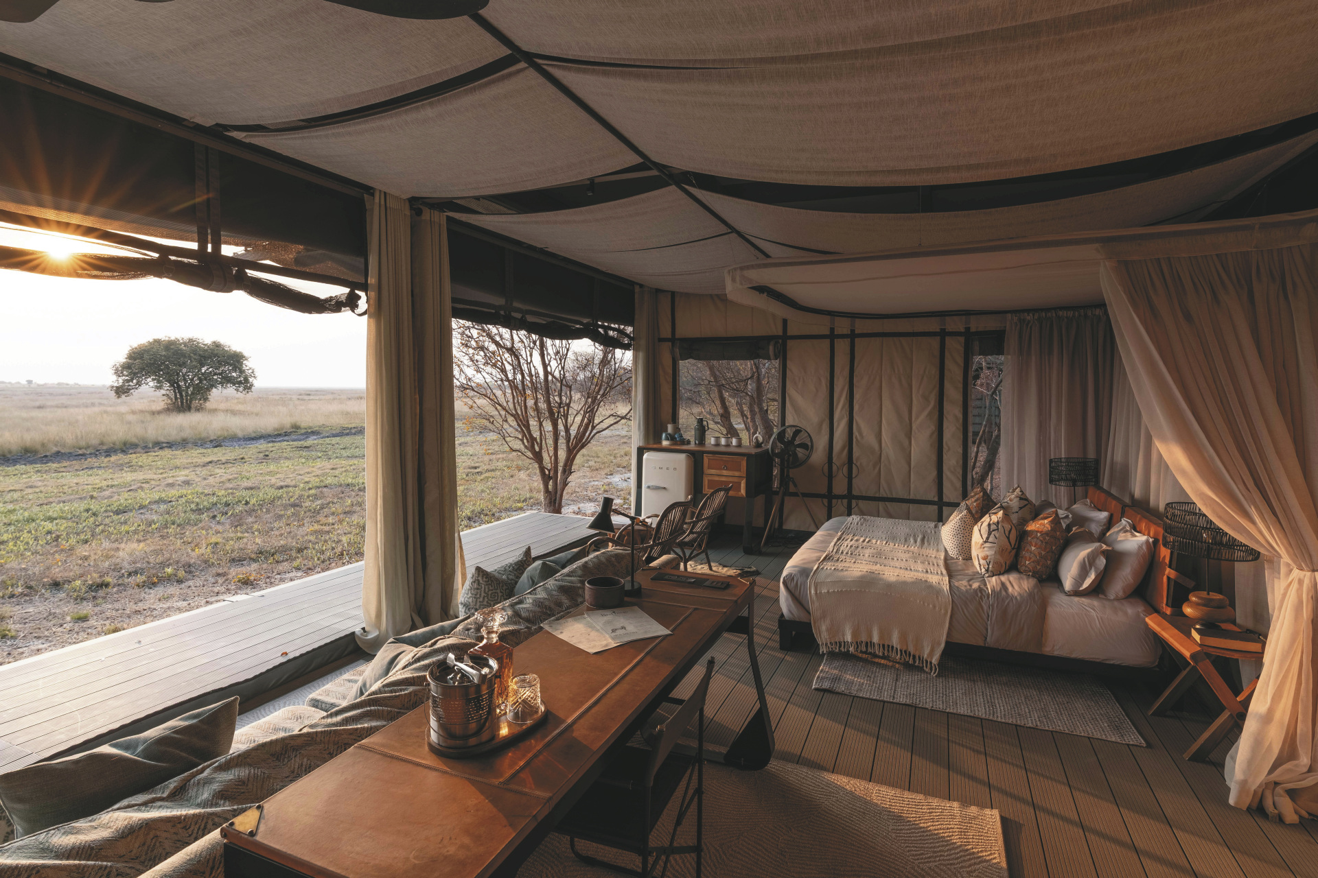 Die 6 Luxus-Zelte sind auf Holzplattformen errichtet und öffnen sich mit großen Fronten zur endlosen Savanne. Im Inneren erwarten Sie ein großzügiger Schlafbereich, edle Naturmaterialien und ein eigenes Badezimmer mit Dusche. Jedes Zelt verfügt über eine private Veranda, auf der Sie die Sonnenuntergänge in völliger Abgeschiedenheit genießen können. Die offene Gestaltung bringt Sie der Natur ganz nah und schafft ein unvergleichliches Gefühl von Freiheit.
