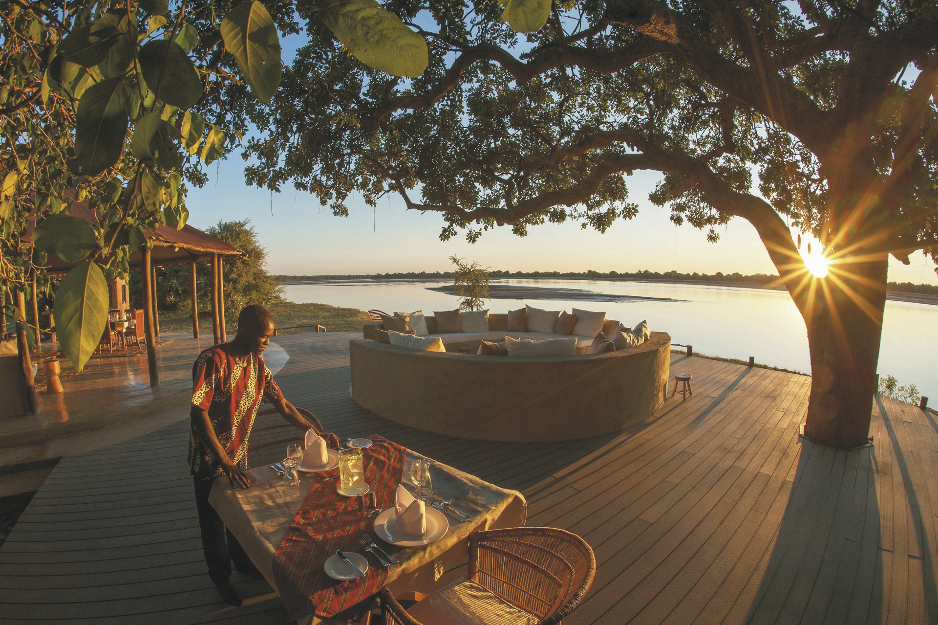 Unter dem Schatten von Sausage Trees am Ufer des Luangwa Flusses gelegen, bietet das Three Rivers Camp ein besonderes Wildniserlebnis, bei dem Wandersafaris im Mittelpunkt der Aktivitäten stehen. Die offene Lounge mit Bar und Feuerstelle lädt zum Entspannen ein – mit Blick auf sonnenbadende Flusspferde und vorbeiziehende Giraffen. Kulinarisch verwöhnt das Camp mit einem reichhaltigen Brunch und stilvollen Abendessen am Flussufer.Eingeschlossene Aktivitäten: Pirschfahrten, Buschwanderungen.