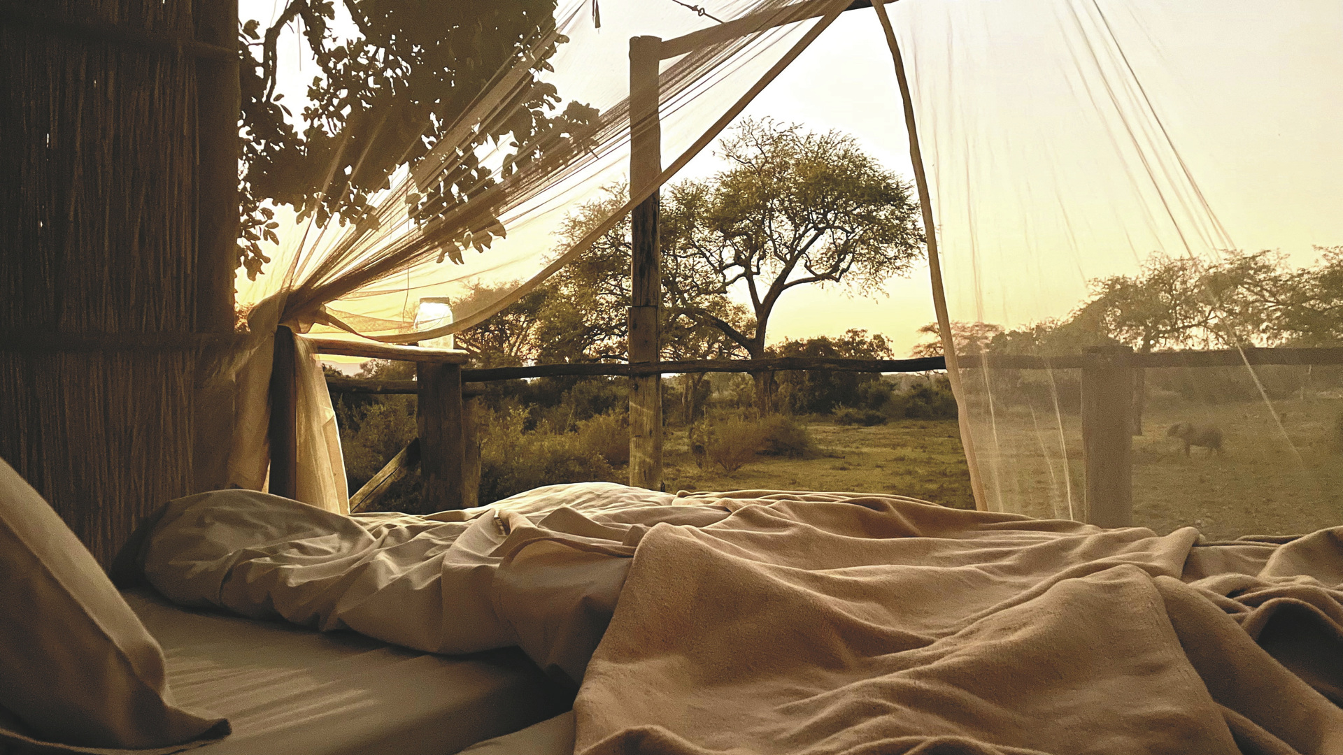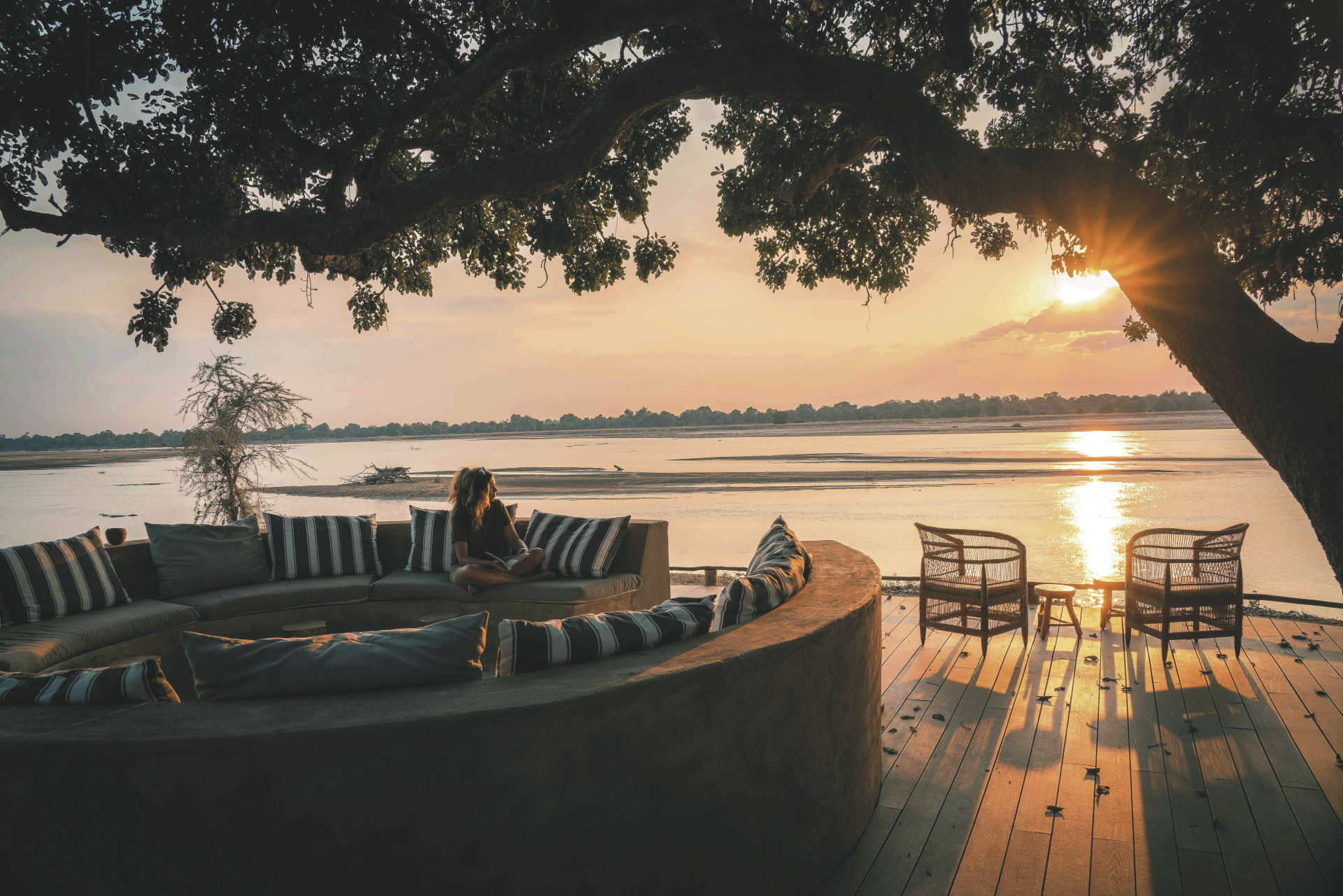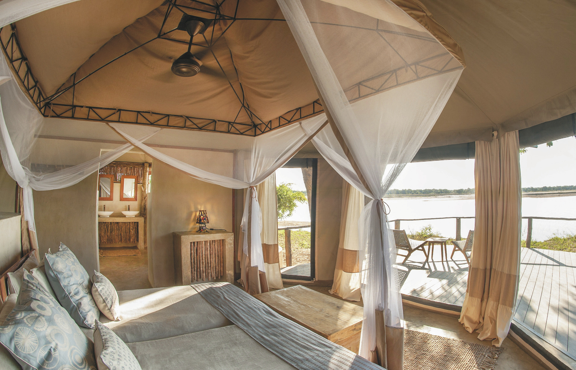 Die 5 geräumigen Safarizelte sind stilvoll mit natürlichen Materialien und warmen Erdtönen eingerichtet. Große Fenster eröffnen weite Ausblicke auf den Fluss oder die tierreiche Lagune. Jedes Zelt verfügt über eine private Holzterrasse, ein elegantes Badezimmer mit Innen- und Außendusche, Doppelwaschbecken und WC. Ein besonderes Highlight: die privaten „Star Beds“ auf erhöhten Plattformen – für eine Nacht unter dem afrikanischen Sternenhimmel.