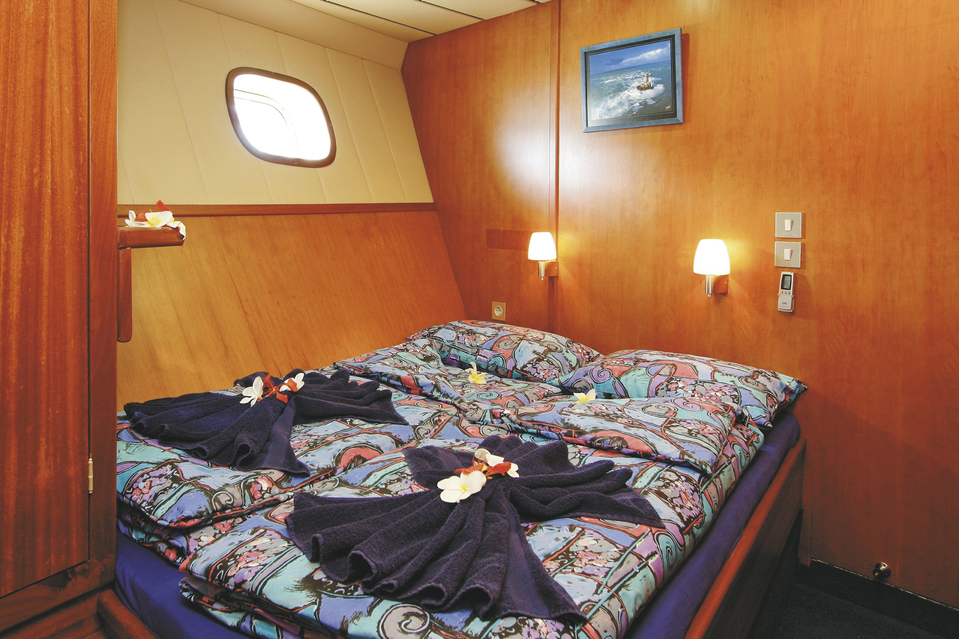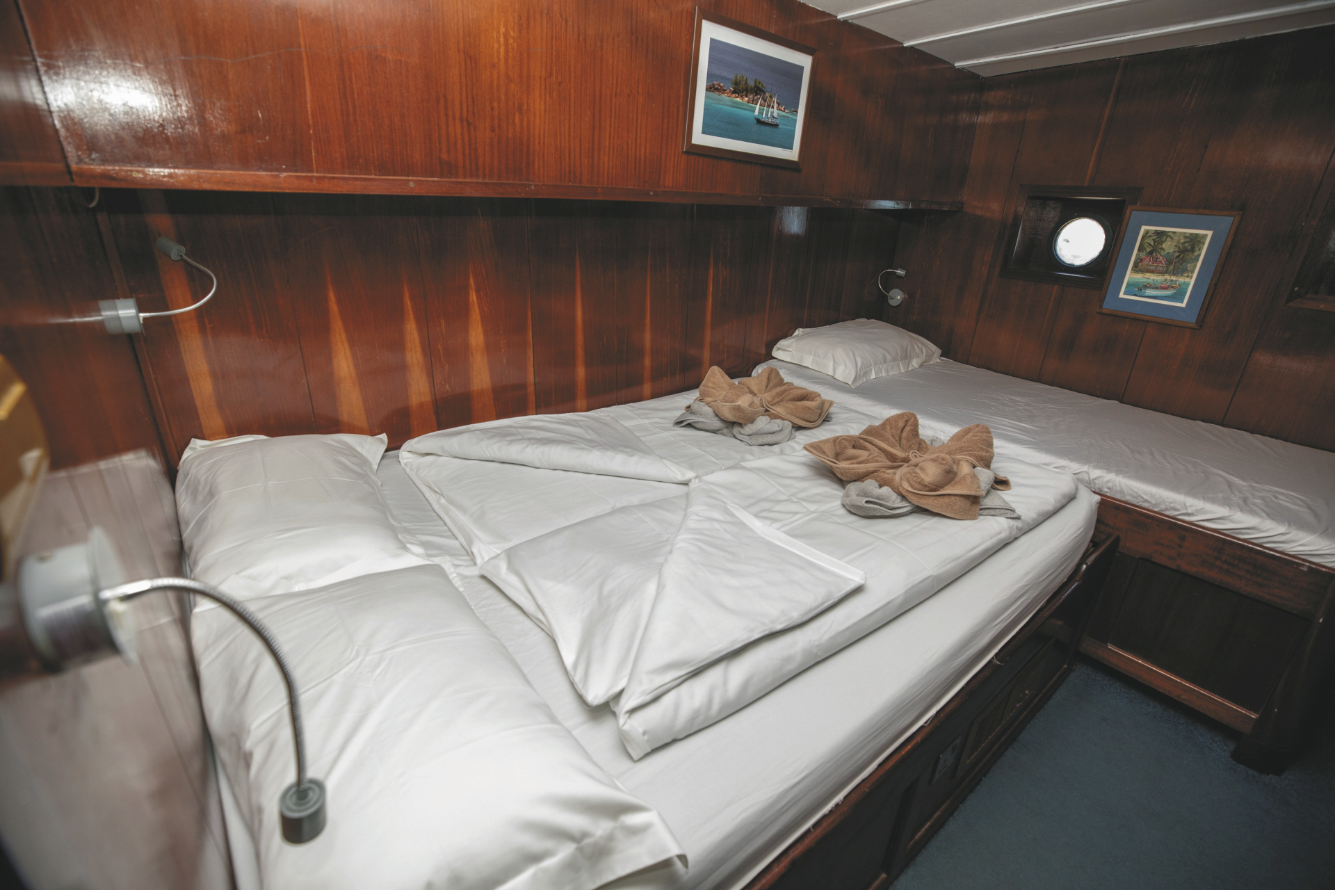 Die S.Y. Sea Star & S.Y. Sea Bird sind vollausgestattete Yachten mit je 9 Doppelkabinen (buchbar mit privatem Bad). Die Katamarane sind ca 40 Meter lang und ca 8 Meter breit. Alle Kabinen und der Salon sind mit einer Klimaanlage ausgestattet. Über das traditionelle technische Equipment steht den Gästen TV, CD- und DVD-Player und eine voll ausgestattete Küche zur Verfügung. Handtücher und Bettwäsche werden zur Verfügung gestellt. Betreut werden Sie durch die acht- bis neunköpfige Crew bestehend aus Kapitän,