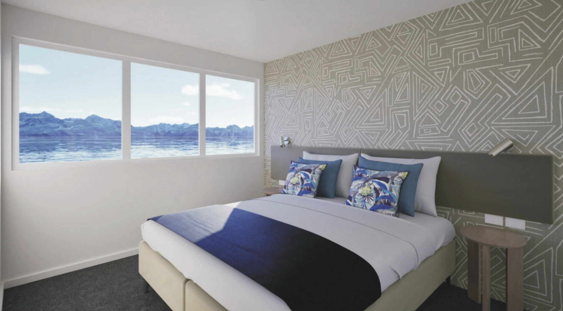 Alle Kabinen befinden sich oberhalb des Wassespiegels, sind ca. 14.5 m² groß, bieten große Fenster mit Meerblick, Klimaanlage, privates Bad mit Fön, TV/DVD, Stauraum, Minibar (am 1. Tag aufgestockt mit alkohlischen und nichtalkoholischen Getränken), Begrüßungsgeschenk in Form einer Tragetasche mit Pure Fiji Kosmetikartikel pro Kabine, einer wiederverwendbaren Metall-Wasserflasche und einem Sulu (Sarong) für jede Person.